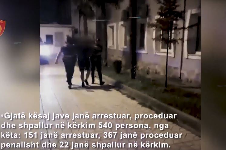“Gjatë kësaj jave janë arrestuar, proceduar dhe shpallur në kërkim 540 persona, nga këta: 151 janë arrestuar, 367 janë proceduar penalisht dhe 22 janë shpallur në kërkim.”- bën me dije Policia.