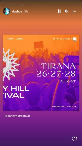 “E lumtur dhe me zemrën plot, jam krenare t’ju them se është vendosur që festivali ynë Synny Hill do të vazhdojë në shtëpinë bazë të tij në datat 4,5,6,7 gusht në Prishtinë, Kosovë dhe tani do të mbajmë edhe 26, 27,28 gusht në Tiranë të Shqipërisë. Mezi presim t’ju shohim të gjithëve atje! Më shumë do të zbulohen së shpejti… Me dashuri Dua.”- ka shkruar këngëtarja.