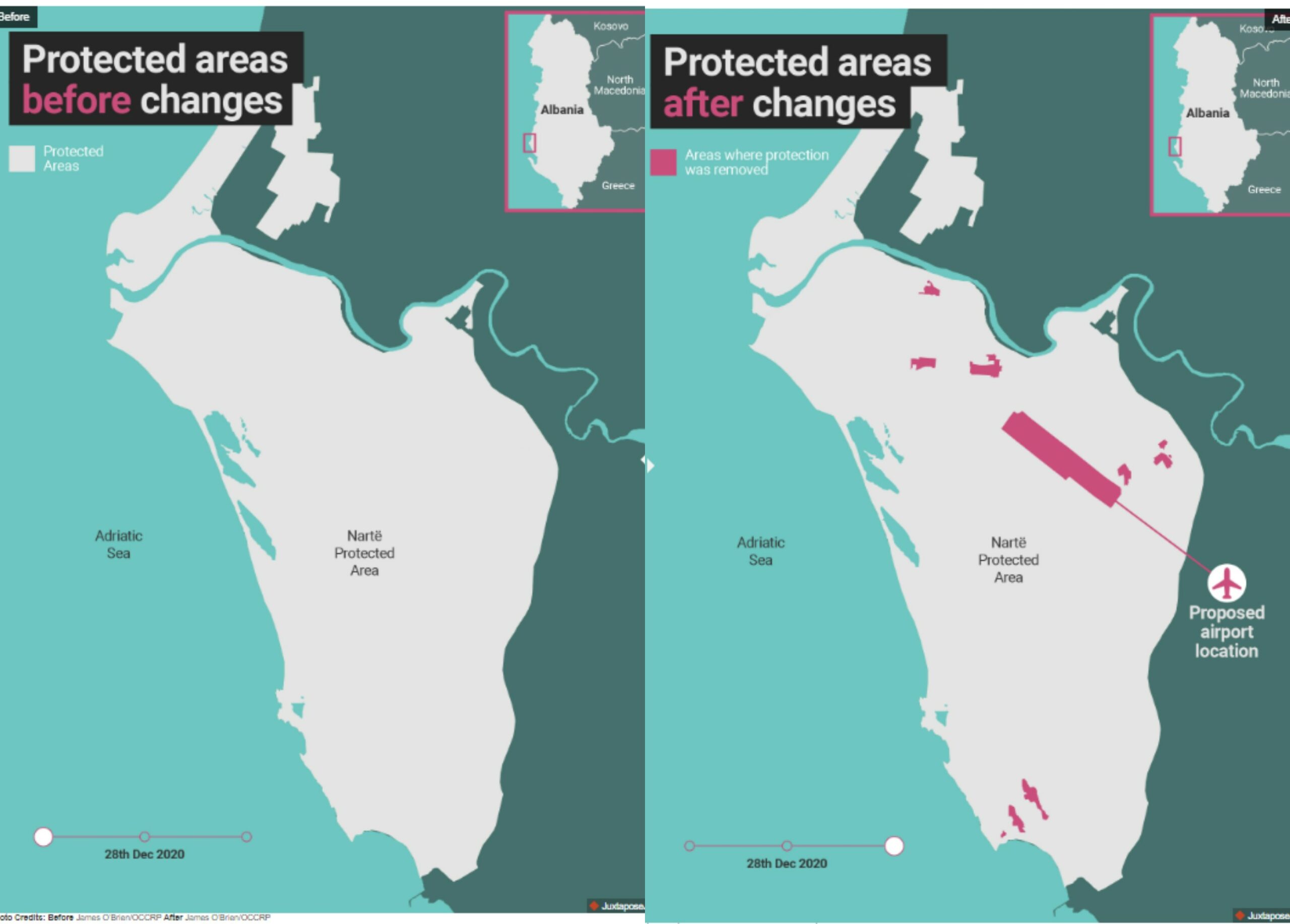Kur Rama propozoi për herë të parë ndërtimin e aeroportit të Vlorës, pas bisedimeve me Erdoganin, qeveria e Shqipërisë filloi të diskutonte për ndryshimet në rezervatet natyrore të vendit. Pak muaj pasi u shpallën fituesit e tenderit për ndërtimin e saj, një këshill i kryesuar nga Rama miratoi rivizatimin e kufijve të më shumë se një të katërtës së ekosistemeve bregdetare të vendit – përfshirë zonën pranë lagunës Vjosa-Nartë ku do të ndërtohet aeroporti.