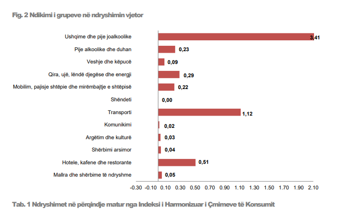Ndryshimet e kontributit nga një tregues në tjetrin lidhen me faktin se kompozimi i peshave të mallrave brenda grupit “Ushqime dhe pije joalkoolike” është i ndryshëm nga një tregues në tjetrin.