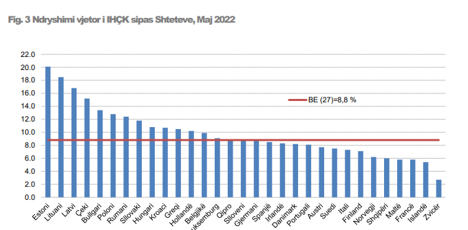 Të dhënat tregojnë se inflacioni në Shqipëri në muajin maj u rrit më pak se mesatarja europiane 8.8%. Estonia dhe Lituania kishin nivelet më të larta të inflacionit në maj përkatësisht me 20 dhe 18.2% dhe në krahun tjetër Zvicra dhe Islanda kishin nivelet më të ulëta të inflacionit përkatësisht me 2.4 dhe 4.6%.
