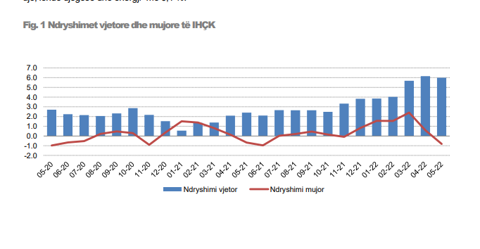 Në muajin maj 2022, ndryshimi mujor i matur nga Indeksi i Harmonizuar i Çmimeve të Konsumit është -0,8%. Ky ndryshim është ndikuar kryesisht nga ulja e çmimeve të grupit “Ushqime dhe pije joalkoolike” me 2,4%, pasuar nga grupi “Argëtim dhe kulturë” me 2,3%.
