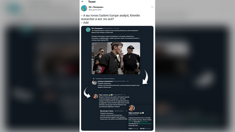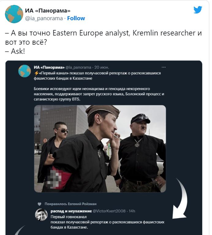 ‘Panorama’ publikoi një shkrim të shkurtër në mediat e saj sociale të hënën, duke pretenduar se televizioni kryesor i Rusisë, Channel One, transmetoi një film mbi të ashtuquajturat ‘bandat e tërbuara fashiste në Kazakistan’.