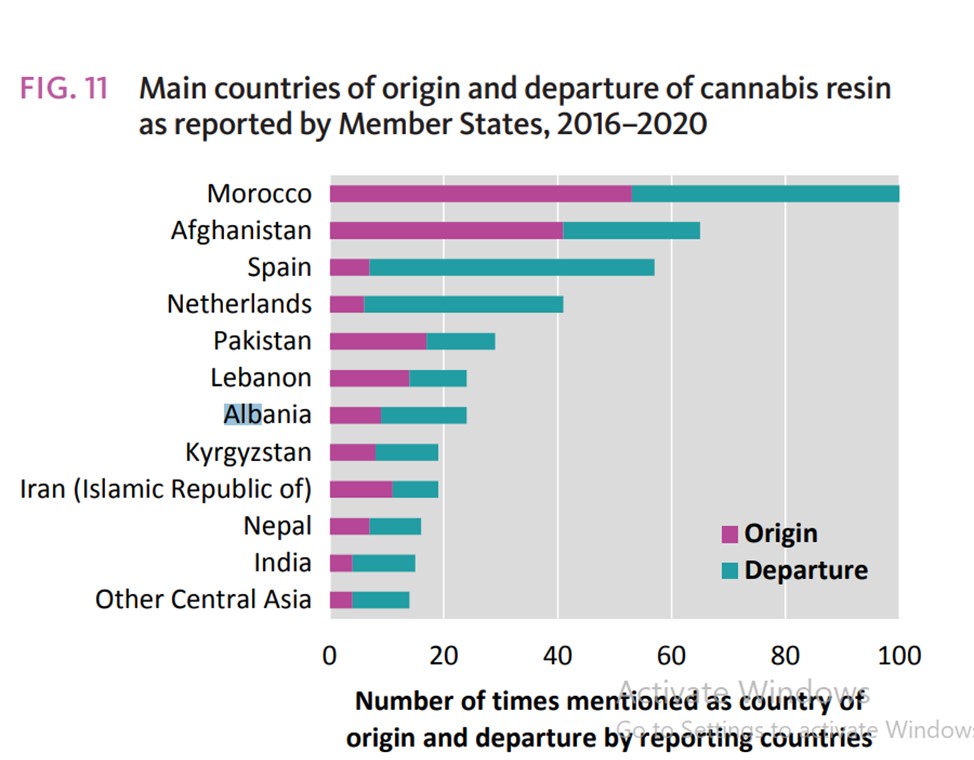 Sipas raportit, Shqipëria është e shtata në botë nga shtetet më të përmendura për origjinën, nisjen dhe tranzitin e barit të kanabisit për periudhën 2016-2019, (nga 154 shtete gjithsej) pas Marokut, Afganistanit, Spanjës. Holandës, Pakistanit dhe Libanit (shiko grafikun).