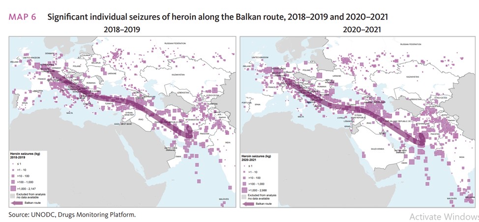Shqipëria përmendet edhe në të ashtuquajturën rrugë të Ballkanit për heorinën, që fillon nga Pakistani, kalon nëpër Siri, Turqi, Greqi, Shqipëri dhe përfundon në vendet e Europës Perëndimore.