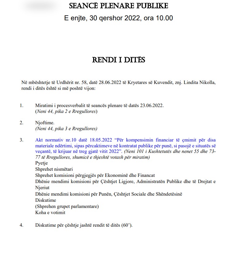 Kuvendi i Shqipërisë mblidhet sot në orën 10:00 për të miratuar akti normativ për kompensimin e çmimeve të materialeve të ndërtimit.