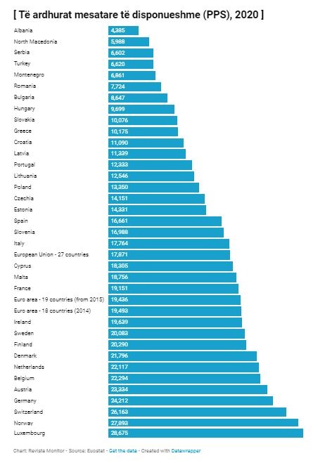 Të ardhurat mesatare të disponueshme të shqiptarëve në vitin 2020 ishin 4,385 PPS (njësi që mat të ardhurat sipas standardit të fuqisë blerëve) për banor, më të ulëtat në Europë, sipas një raporti të fundit të Eurostat.