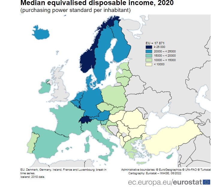 Nivelet më të larta të të ardhurave mesatare të disponueshme u regjistruan në shtetet anëtare perëndimore dhe nordike të BE-së, si Luksemburgu (28 675 PPS), Gjermania (24 212 PPS), Austria (23 334 PPS) dhe Belgjika (22 294 PPS). Nga ana tjetër, të ardhurat mesatare të disponueshme ishin më të ulëta në shumicën e Shteteve Anëtare jugore dhe lindore, si Rumania (7 724 PPS), Bullgaria (8 647 PPS), Hungaria (9 699 PPS) dhe Sllovakia (10 076 PPS).