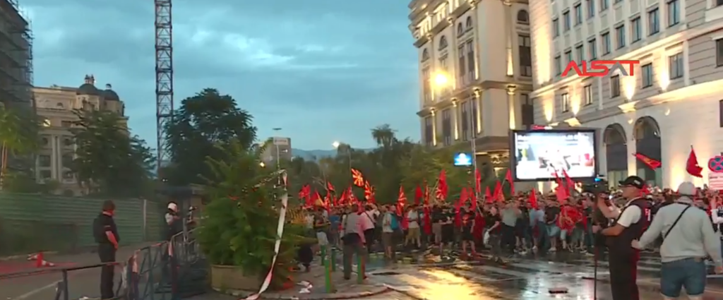 Protestuesit kanë filluar të gjuajnë me mjete piroteknike, e po ashtu janë dëgjuar edhe thirrje të shumta kundër propozimit.