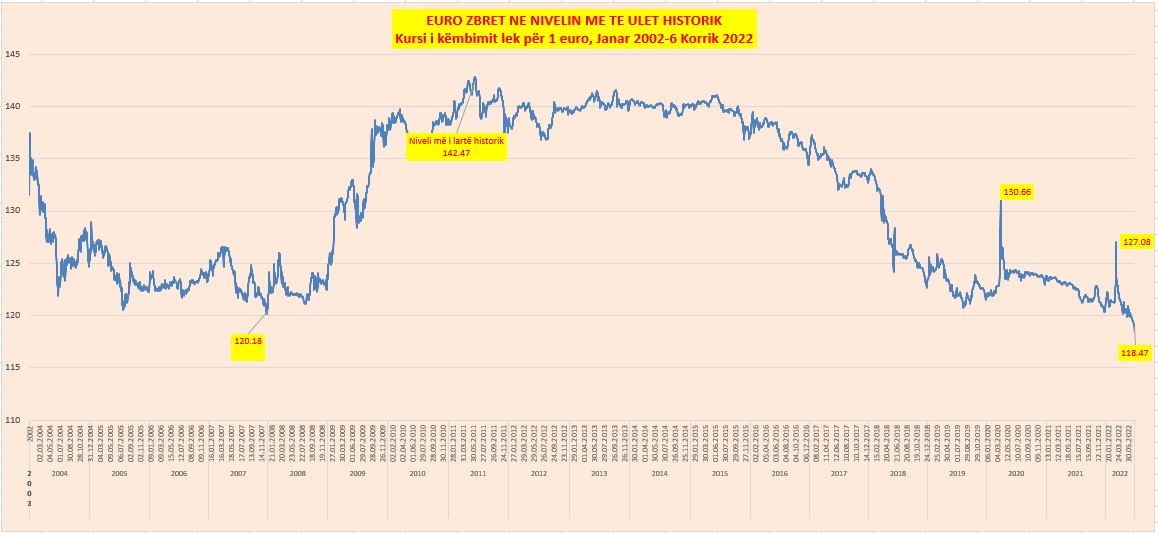 Euro shënoi një tjetër rekord të minimumit historik gjatë ditës së sotme në tregun vendas, duke zbritur në 118.47 lekë, me një rënie prej 0.46 lekësh në raport me ditën e mëparshme, duke vendosur një tjetër rekord minimal historik në tregun e brendshëm, që prej daljes në treg të monedhës së përbashkët.