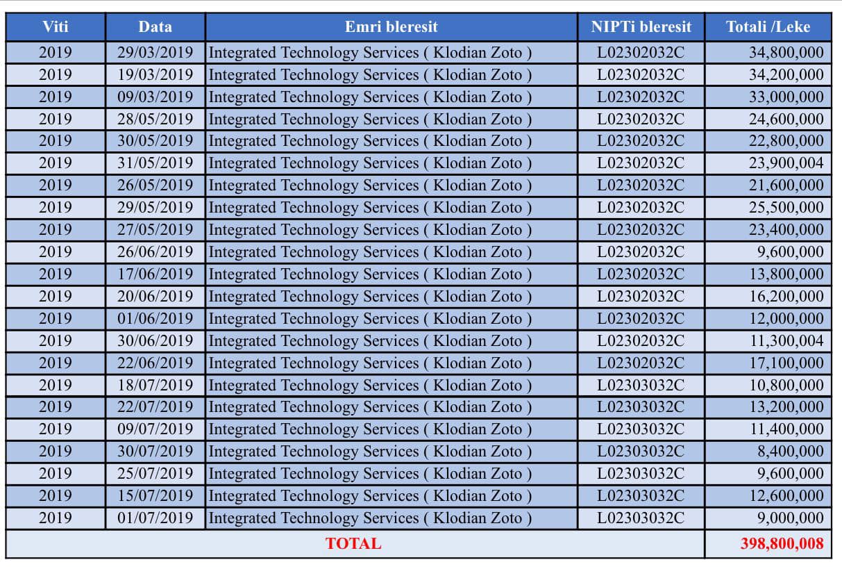 Qeveria thotë se i kanë hetuar kompanitë fiktive në vitin 2018, por shikoni tabelën e mëposhtme që tregon se në vitin 2019, pra 1 vit pas hetimit të tyre, kompania fiktive “Elvis 03 Group”, i ka bërë fatura fiktive kompanisë ITS të Klodian Zoto, në vlerën e 3.5 milionë dollarëve.