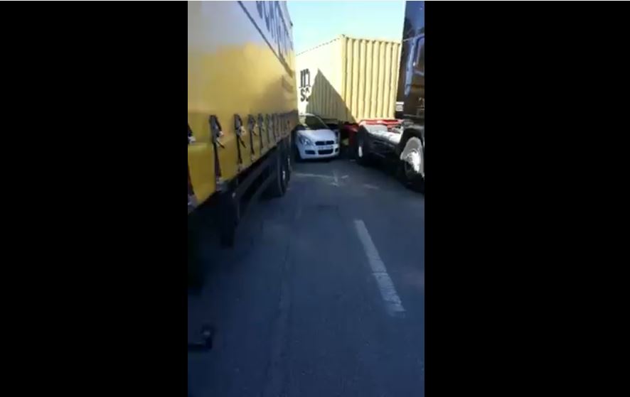 Besohet se manovrimi i gabuar në krah të kundërt ka bërë që mjeti i vogël të ngecet mes 2 kamionëve, shoferët e të cilëve kanë bërë përpjekje për ta shmangur rrezikun.