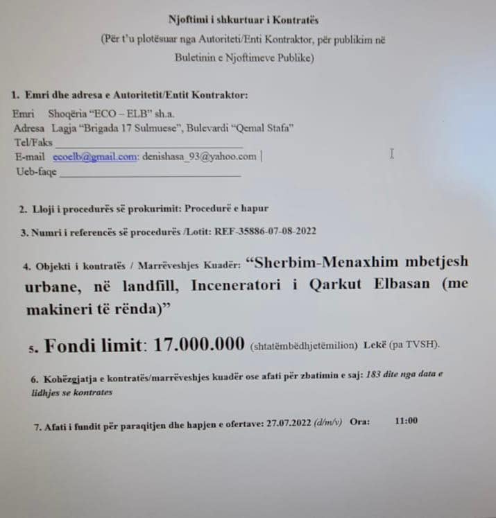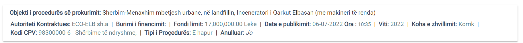 Në një vëzhgim në Agjencinë e Prokurimit Publik njoftimi për këtë tender është publikuar në 6 korrik me një fond limit prej 17 mln lekë.