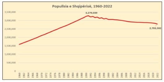 Nga viti 1960, kur Eurostat raporton të dhënat, popullsia e Shqipërisë u dyfishua, duke kulmuar në vitin 1991 me gati 3.3 milionë banorë. Më pas, filloi tkurrja e ndikuar fillimisht nga emigracioni i lartë dhe më pas si nga rikthimi i ciklit të emigracionit dhe plakja graduale e popullsisë, e ndikuar si nga emigracioni, ashtu dhe nga numri i lindjeve.