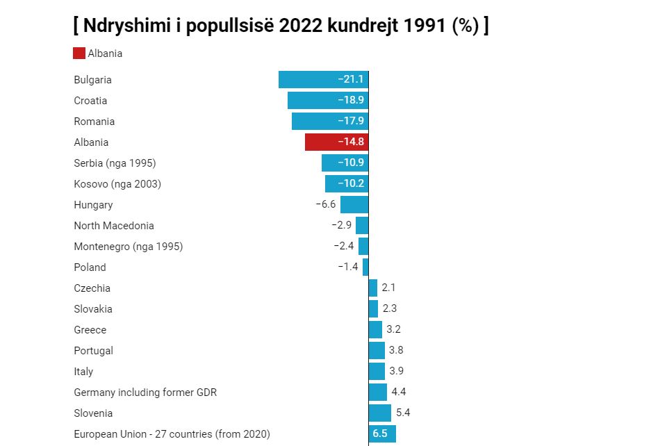 Rekordin në Europë për tkurrjen e popullsisë nga fillim vitet 1990 e mban Bulgaria, me -21.1, e ndjekur nga Kroacia (-18.9) dhe Rumania (-17.9).