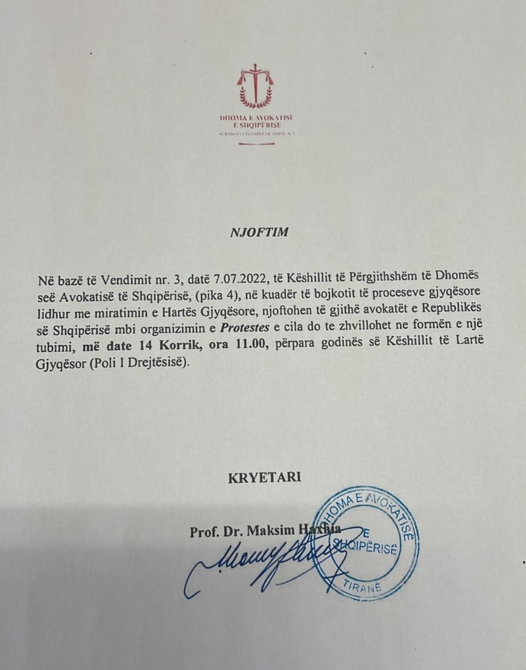 “Në bazë të vendimit nr.3 datë 7.07.2022 të Këshillit të Dhomës së Avokatisë së Shqipërisë në kuadër të bojkotit të proceseve gjyqësore lidhur me miratimin e Hartës Gjyqësore njoftohen të gjithë avokatët e Shqipërisë mbi organizimin e protestës që do të zhvillohet në formën e një tubimi me datë 14 Korrik, ora 11:00 përpara godinës së Këshillit të Lartë Gjyqësor.”– thuhet në njoftim.