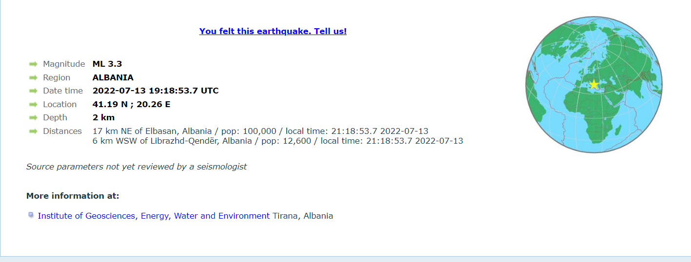 Lëkundje tërmeti janë shënuar në Shqipëri pak minuta më parë.
