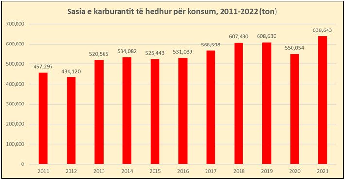 Siç shikohet nga grafiku: “Sasia e karburantit të hedhur për konsum 2011-2021”, konsumi ka pasur trendin rritës me përjashtim të viti 2014 për arsye të politikës fiskale, vitit 2020 për arsye të pandemisë dhe 6-mujorit aktual 2022 e ndikuar fort nga lufta në Ukrainë.