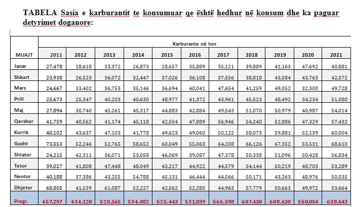 Sipas të dhënave të Doganave, ndër vite konsumi i karburantit ka trend rritës dhe rekordin historik e ka arritur në vitin 2021 me shifrën prej 638,643 ton.