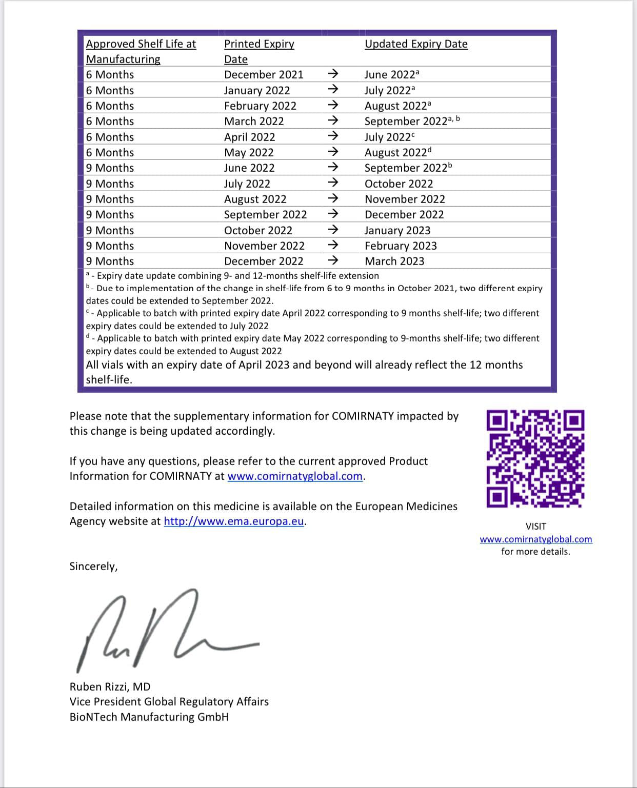 Zgjatja e datës së skadencës së vaksinës Comirnaty (PfizerBioNTech) nga 3 në 6 dhe 9 muaj (shelf- life extention) nga data e reflektuar në vaksinë, sipas loteve të prodhuara dhe të shpërndara në nivel botëror, është miratuar nga të gjitha institucionet kombëtare dhe ndërkombëtare të sigurisë dhe cilësisë së barnave EMA dhe FDA.