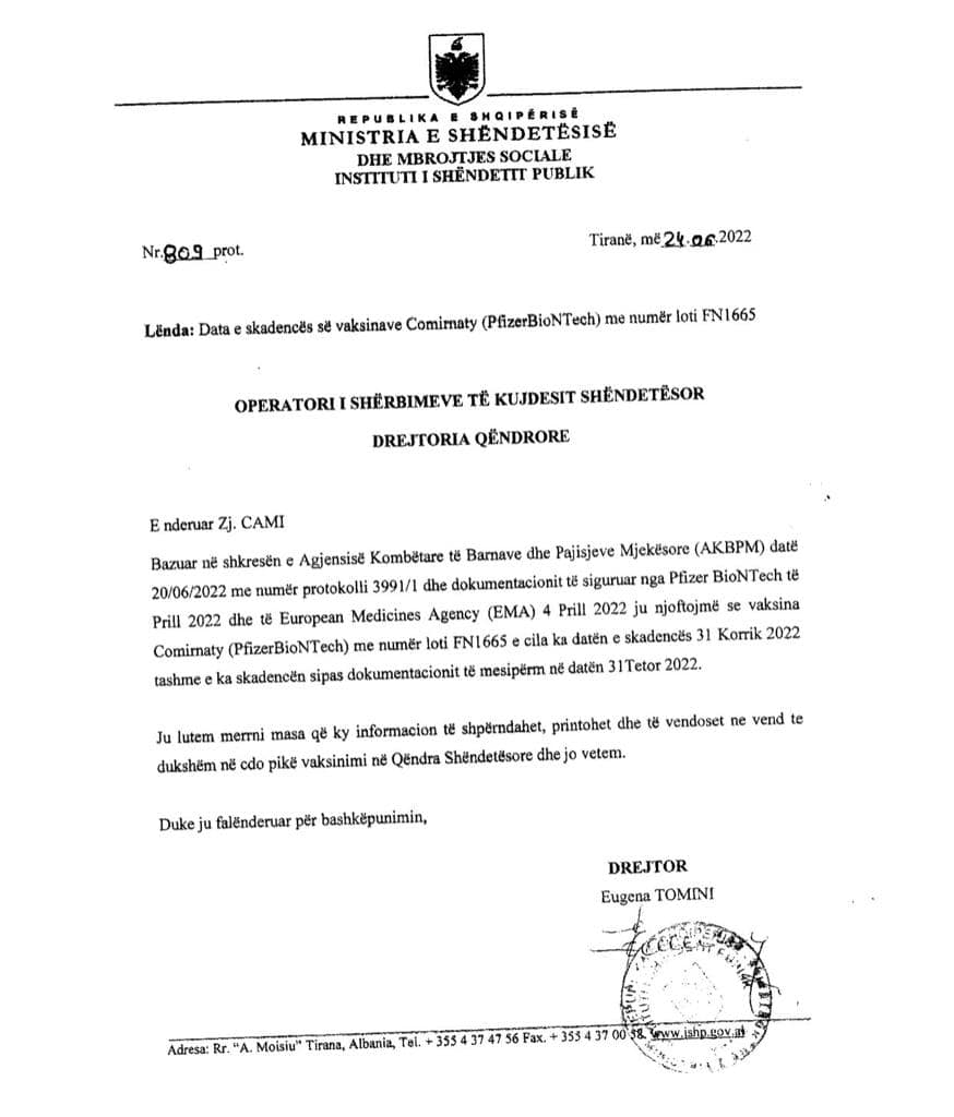 Ai i referohet denoncimit të qytetarit dixhital, që shkruan: “Përshëndetje dr., po ju informoj se jemi urdhëruar të vazhdojmë vaksinimin me lotin e vaksinës Pfizer që ka skaduar në Korrik dhe sipas urdhrit duhet që këtë lot ta përdorim gjer në tetor.”