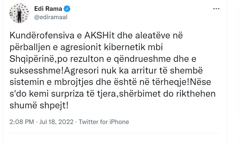 “Kundërofensiva e AKSH-it dhe aleatëve në përballjen e agresionit kibernetik mbi Shqipërinë, po rezulton e qëndrueshme dhe e suksesshme! Agresori nuk ka arritur të shembë sistemin e mbrojtjes dhe është në tërheqje! Nëse s’do kemi surpriza të tjera, shërbimet do rikthehen shumë shpejt.” – shkruan Rama.