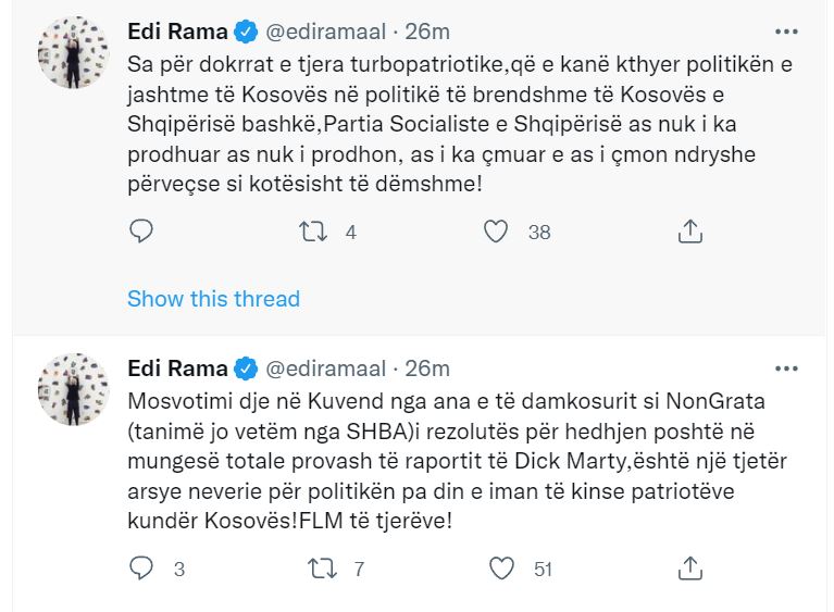“Mosvotimi dje në Kuvend nga ana e të damkosurit si NonGrata (tanimë jo vetëm nga SHBA) i rezolutës për hedhjen poshtë në mungesë totale provash të raportit të Dick Marty,është një tjetër arsye neverie për politikën pa din e iman të kinse patriotëve kundër Kosovës!FLM të tjerëve!Sa për dokrrat e tjera turbopatriotike,që e kanë kthyer politikën e jashtme të Kosovës në politikë të brendshme të Kosovës e Shqipërisë bashkë,Partia Socialiste e Shqipërisë as nuk i ka prodhuar as nuk i prodhon, as i ka çmuar e as i çmon ndryshe përveçse si kotësisht të dëmshme!” – shkruan Rama.