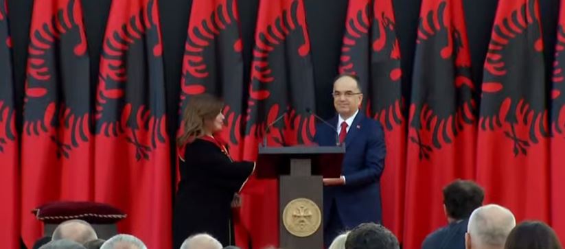 Në mënyrë simbolike kryetarja e Gjykatës Kushtetuese, Vitore Tushaj, ia dorëzoi detyrën Presidentit të ri Bajram Begaj.