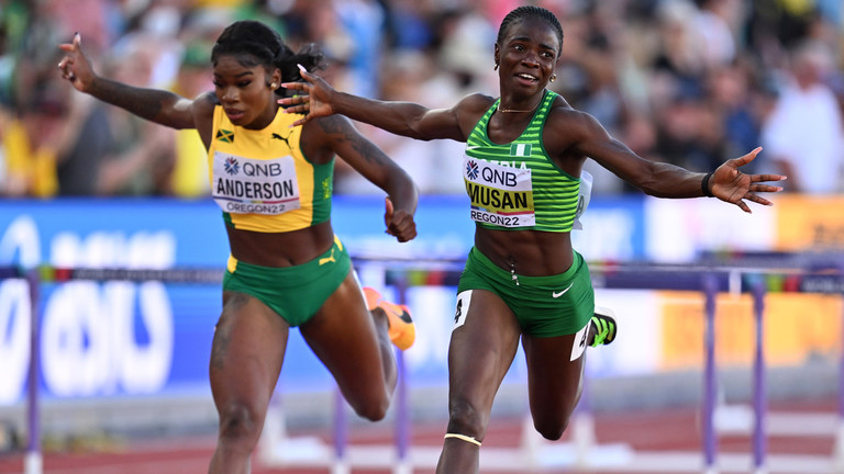 Amusan shënoi një kohë mahnitëse prej 12.12 sekondash në garën e saj gjysmëfinale, duke mposhtur rekordin e mëparshëm botëror të femrave të vendosur nga Kendra Harrison me 0.08 sekonda dhe theu edhe rekordin e saj personal me pothuajse 0.3 sekonda.