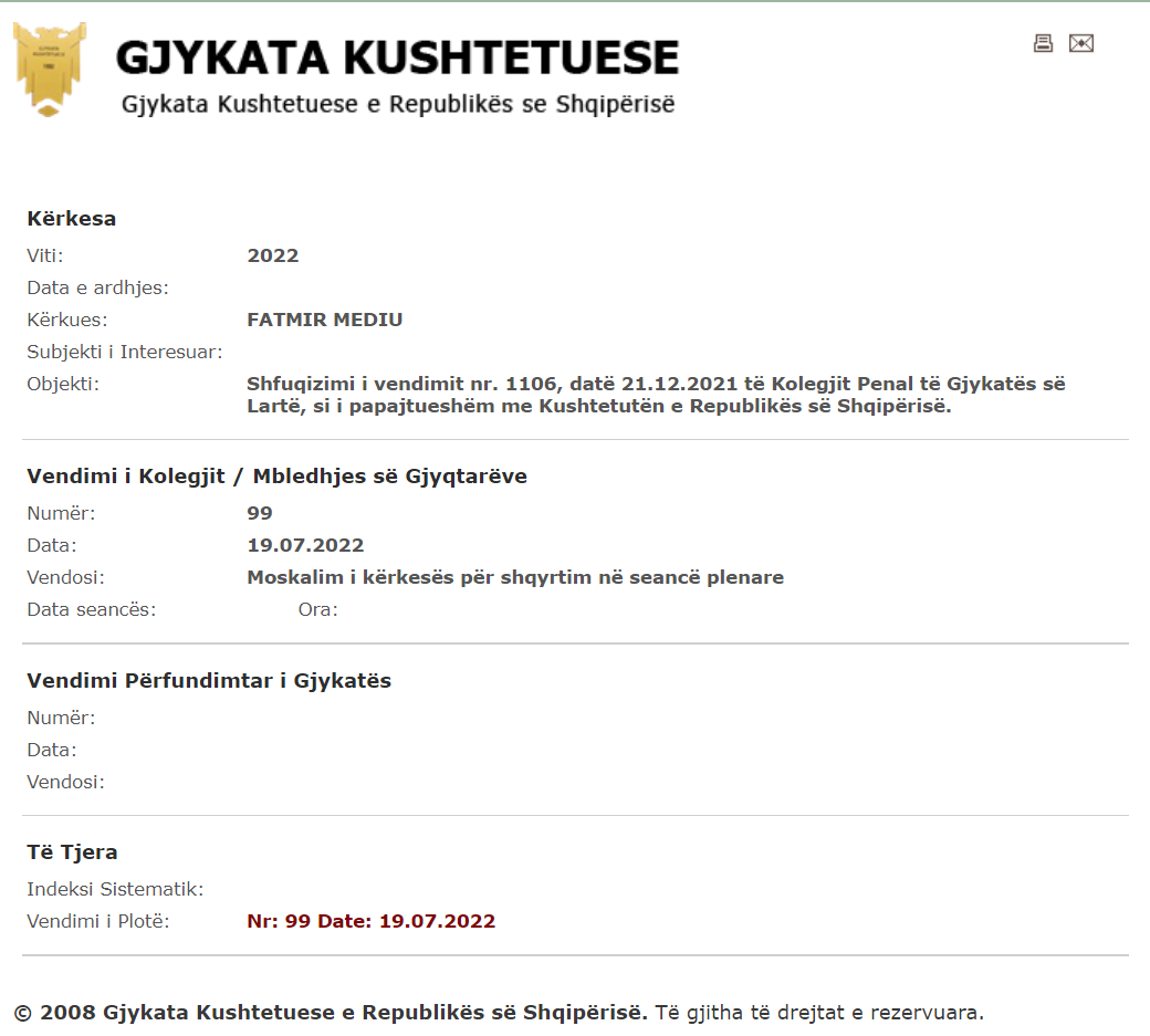 Gjykata Kushtetuese ka rrëzuar ankimimin e deputetit Fatmir Mediu kundër vendimit të Gjykatës së Lartë e cila kthente për gjykim në SPAK çështjen “Gërdeci” pas ankesës më datën 26.02.2021, të shtetasve F.D. dhe Z.D., trashëgimtarë të të ndjerit E.D., njëri prej viktimave të ngjarjes së Gërdecit të datës 15.03.2008.