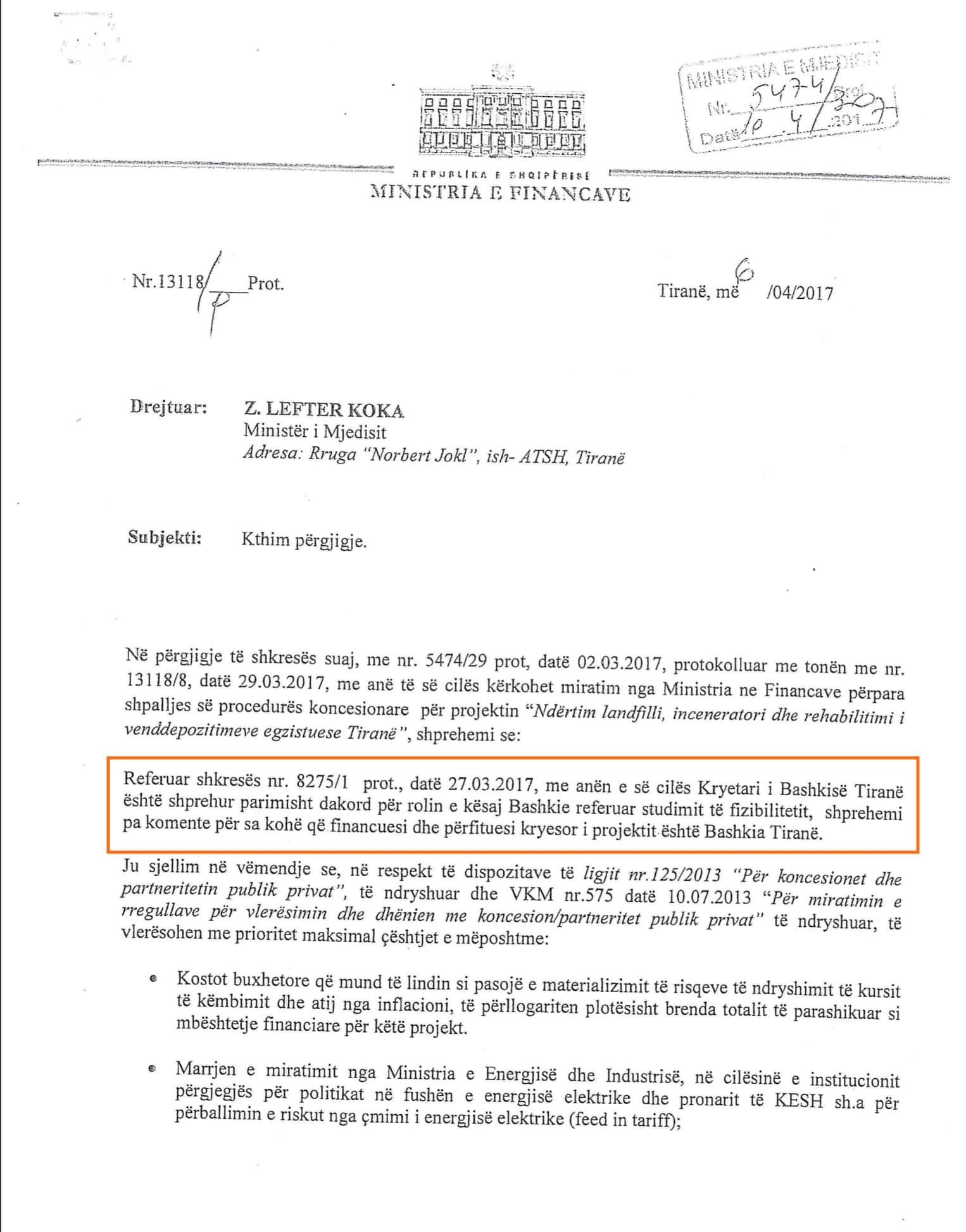 Këtë vlerë “të artë” që ka pasur firma e Veliaj, e tregon më së miri, ministri i Financave në shkresën e radhës për procedurën koncesionare: “Referuar shkresës nr. 8275/1 prot., datë 27.03.2017, me anën e së cilës Kryetari i Bashkisë Tiranë është shprehur parimisht dakord për rolin e kësaj Bashkie referuar studimit të fizibilitetit, shprehemi pa komente për sa kohë që financuesi dhe përfituesi kryesor i projektit është Bashkia Tiranë.”