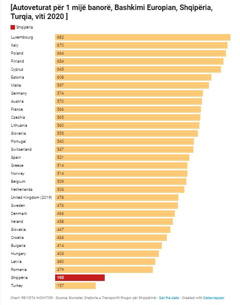 Shqipëria ia kalon vetëm Turqisë, që ka 157 autovetura për një mijë banorë. (të dhënat e rajonit mungojnë, por edhe në vitet e mëparshme, Shqipëria ishte ndër të fundit, me nivele të ngjashme me Maqedoninë e Veriut).