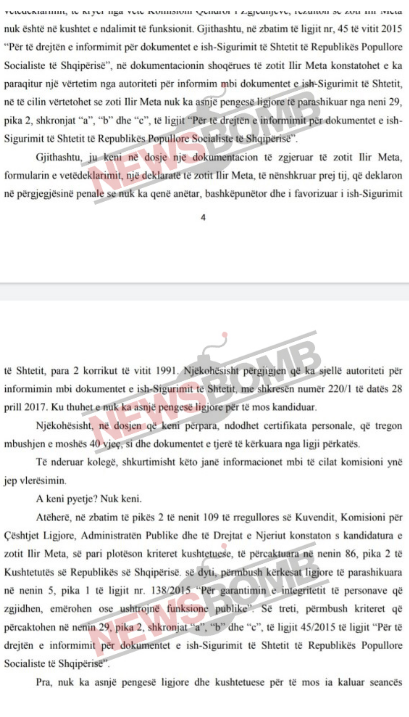 “Gjithashtu, në zbatim të ligjit nr, 45 të vitit 2015, “Për të drejtën e informimit për dokumentet e ish-Sigurimit të Shtetit të Republikës Popullore Socialiste të Shqipërisë”, në dokumentacionin shoqërues të zotit Ilir Meta konstatohet se ka paraqitur një vërtetim nga autoriteti për informimin mbi dokumentet e ish-Sigurimit të Shtetit, në të cilin vërtetohet se zoti Ilir Meta nuk ka asnjë pengesë ligjore të parashikuar nga neni 29, pika 2, shkronjat “a”, “b” dhe “c”, të ligjit “për të drejtën e informimit për dokumentet e ish-Sigurimit të Shtetit të Republikës Popullore Socialiste të Shqipërisë”.