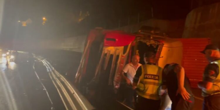 Një kamion ka dalë nga rruga duke u përmbysur ndërsa ka mbetur i plagosur drejtuesi.