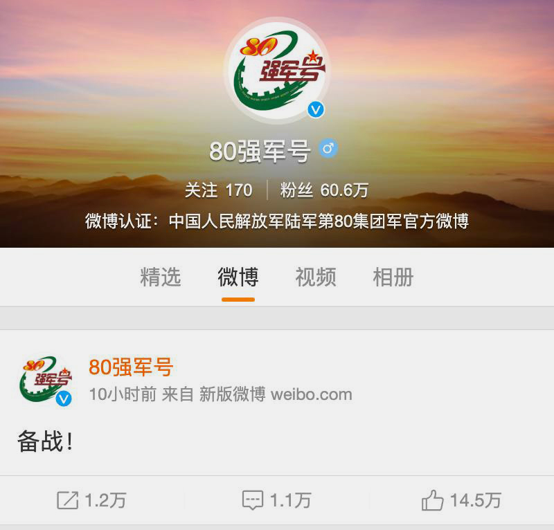 Një mesazh që përmban vetëm dy karaktere në gjuhën kineze u postua të premten në faqen Weibo të ushtrisë, të Grupit të 80-të të forcave të armatosura, me seli në Weifang, provincën Shandong. Postimi nxiti shpejt mbi 300,000 reagime pozitive dhe afro 20,000 komente.