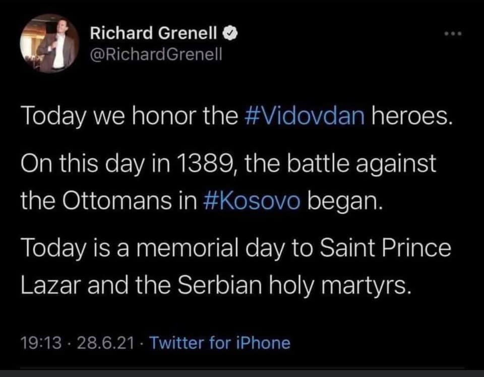 La zananë e zu zurnanë: kështu do t’i thuhej, me një fjalë të vjetër shqipe, ndërrimit të profesionit nga z. Richard Grenell, i cili është vënë të provokojë historinë e popujve të Europës juglindore, kinse për të përkujtuar Betejën e Kosovës të vitit 1389, duke e lidhur me festën fetare të Kishës serbe, – kujtimin e martirizimit të Shën Vitos, – madje edhe me do “Serbian holy martyrs” të betejës në fjalë.