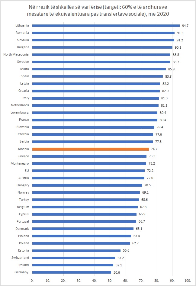 Në Shqipëri. 74.7% e popullsisë në moshë pune rrezikojnë të bien në varfëri, pasi jetojnë në familje me intensitet të ulët të punës, raportoi sot Eurostat.