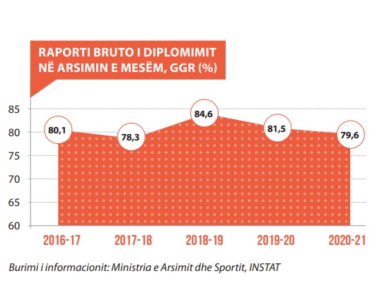 Në vitin shkollor 2020-21, përfunduan studimet në arsimin e mesëm dhe u diplomuan 31.136 nxënës, me një raport bruto të diplomimit (GGR) prej 79,6 %.