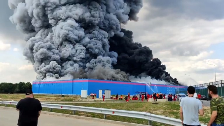 Një zjarr i madh ka përfshirë një depo të platformës kryesore ruse të tregtisë elektronike Ozon pranë Moskës, me qindra njerëz të detyruar të largohen nga vendi.