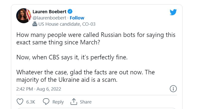 “Sa njerëz u quajtën bashkëpunëtorë rusë se thanë të njëjtën gjë që nga marsi? Tani, kur CBS e thotë atë, është krejtësisht e saktë. Sido që të jetë rasti, të lumtur që faktet janë zbuluar tani. Shumica e ndihmës për Ukrainën është një mashtrim.”