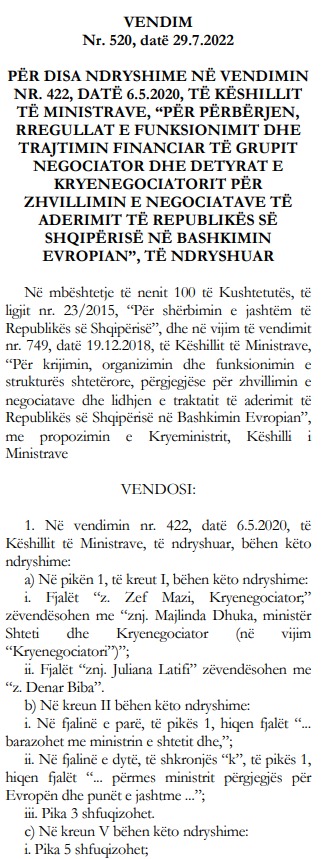 Vendimi mban firmën e kryeministrit Edi Rama dhe u mor kur ai shkarkoi negociatorin Zef Mazi dhe në vend të tij emëroi Majlinda Dhukën.