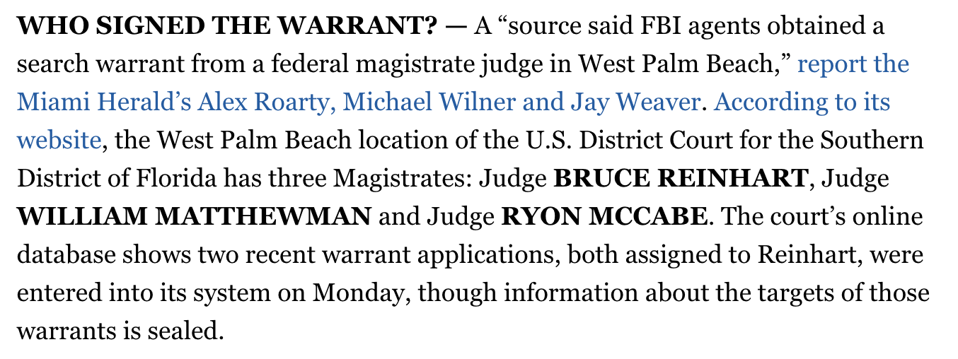 Lidhjet e zbuluara vijnë pasi Reinhart besohet se ka nënshkruar një urdhër përgjegjës për bastisjen në rezidencën e Trump në Palm Beach. Një ‘burim tha se agjentët e FBI-së morën një urdhër kërkimi nga një gjykatës federal në West Palm Beach’, raporton Miami Herald.