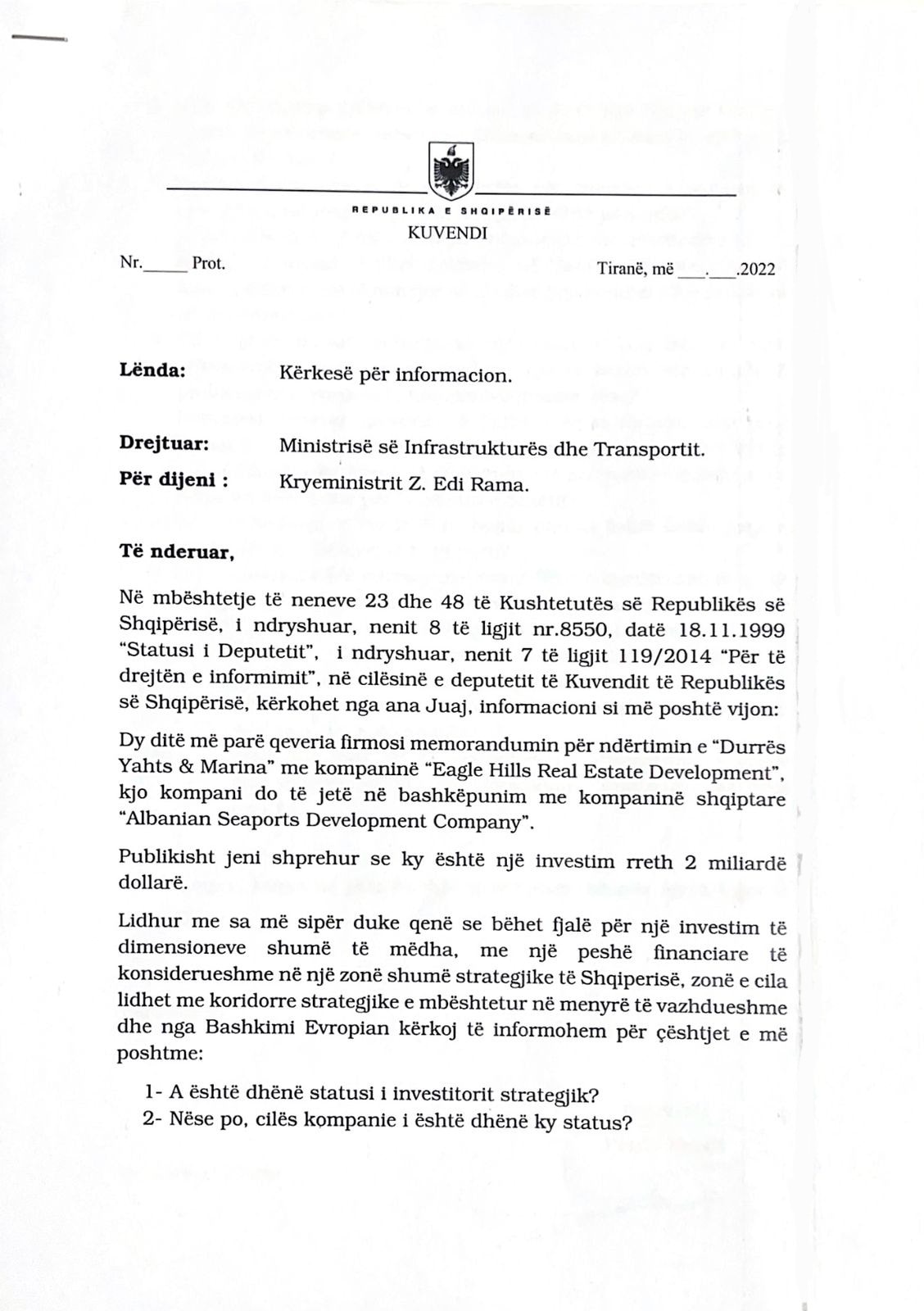 Si Deputet i Kuvendit te Shqipërisë i jam drejtuar Qeverise me kërkesë zyrtare për informacion.