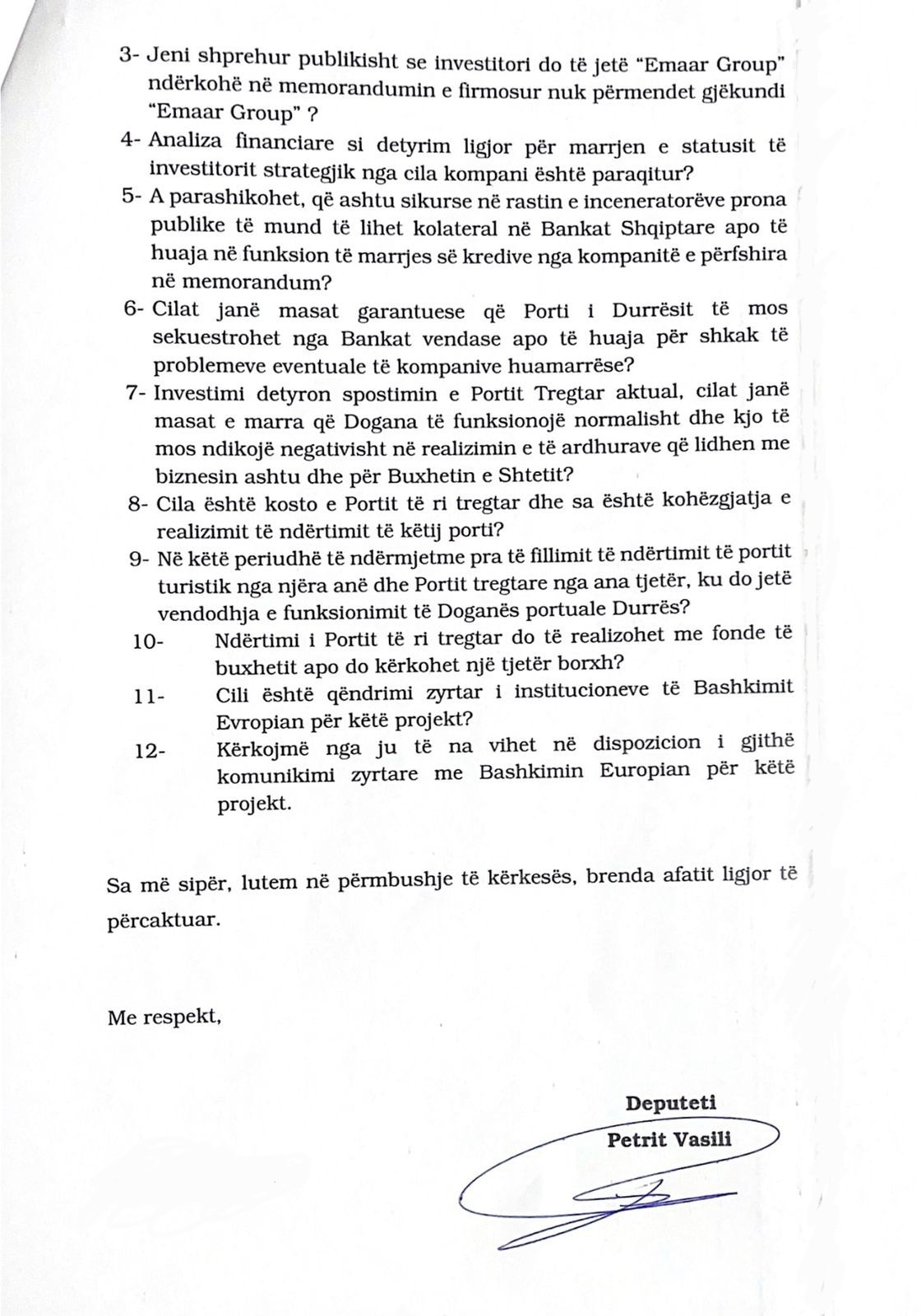 Deputeti i Partisë së Lirisë, Petrit Vasili i është drejtuar me disa pyetje qeverisë për Portin e ri turistik të Durrësit që pritet të ndërtohet.