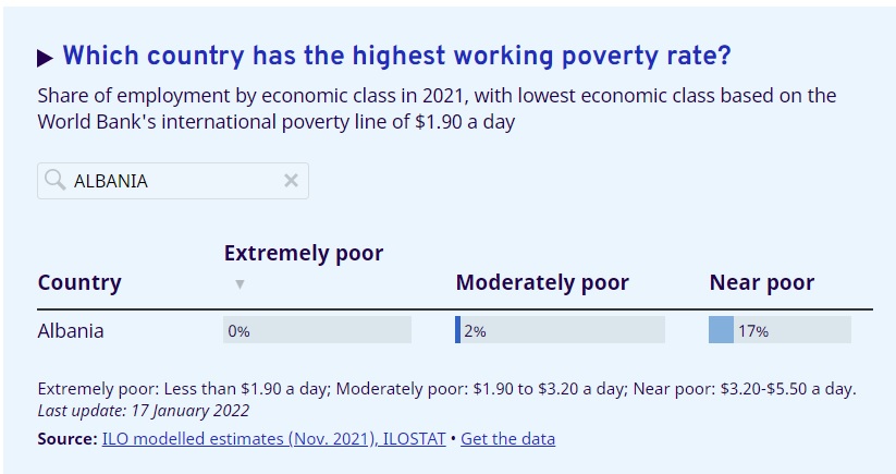 Organizata Ndërkombëtare e Punës (ILO) në publikimin për pagat në nivelin e varfërisë verifikoi se, gati 17 për qind e të punësuarve në Shqipëri me pagë paguhen në intervalin 3.2-5.5 USD në ditë.