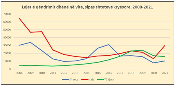 Por, ndërsa deri në vitin 2011 kishte një diferencë të lartë mes lejeve që jepeshin nga Italia dhe Greqia në raport me shtetet e tjera, vitet e fundit diferenca është ngushtuar dukshëm duke treguar një preferencë drejt shteteve të tjera, kryesisht Mbretërisë së Bashkuar dhe Gjermanisë (shiko grafikun: Lejet e qëndrimit dhënë në vite, sipas shteteve kryesore, 2008-2021)