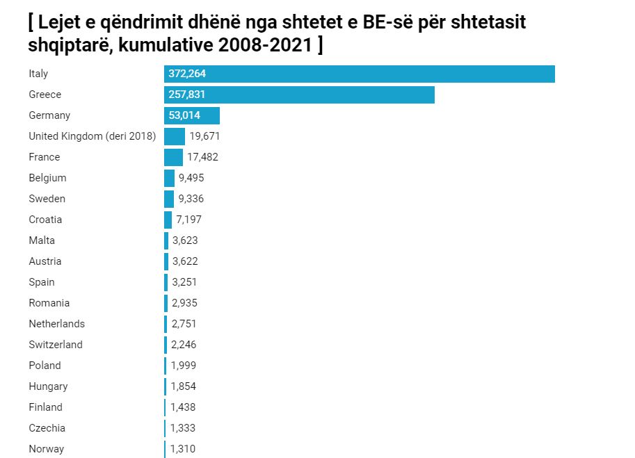 Edhe në vitin 2021, kur u dhanë në total 55 mijë leje nga shtetet e BE-së (pa Mbretërinë e Bashkuar) Italia ishte shteti më bujar, me gati 30 mijë leje, ose 54% të totalit, e ndjekur nga Greqia me 18%.