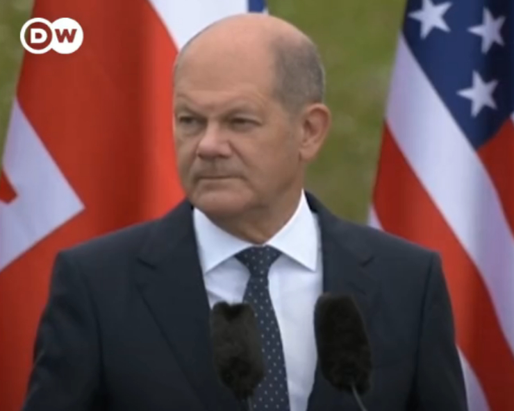 Scholz foli me një sistem altoparlanti ndërsa nuk e pati aspak të lehtë që të dëgkohej në sfondin e zhurmës nga jashtë barrierave.