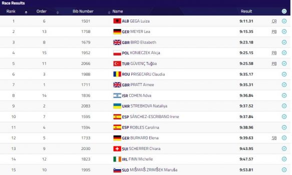 Gega kishte një avantazh prej gati 4 sekondash ndaj atletes më të afërt, që ishte gjermania Lea Meyer.