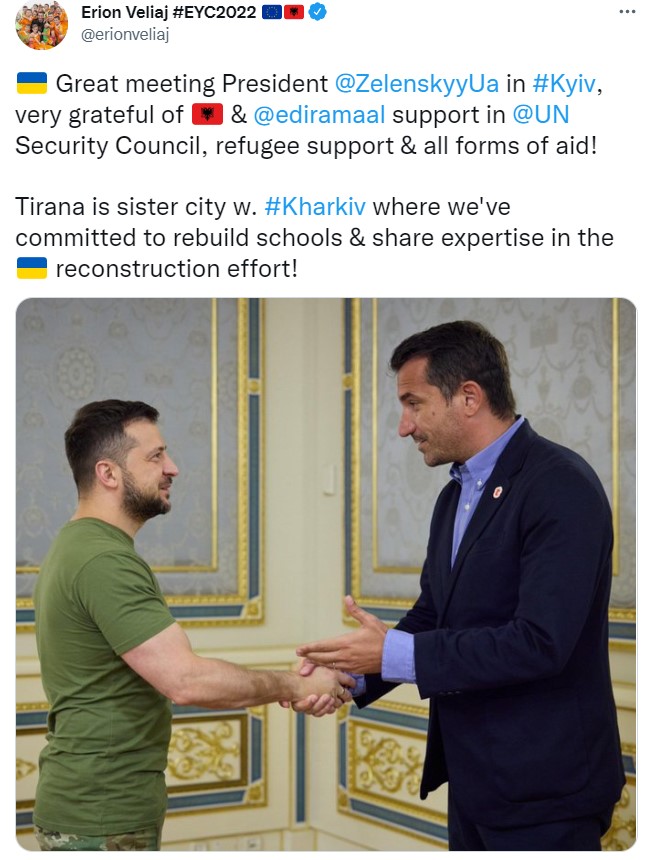 “Shumë i lumtur që u takova me Presidentin Zelensky në Kiev, i cili shprehu mirënjohjen e tij për mbështetjen e Shqipërisë dhe Kryeministrit Rama në Këshillin e Sigurimit, strehimin e refugjatëve dhe çdo ndihmë tjetër. Tirana dhe Kharkivi janë qytete motra ne jemi zotuar të rindërtojmë shkolla aty dhe të japim ekspertizën tonë në rimëkëmbjen e Ukrainës”, thekson Veliaj.
